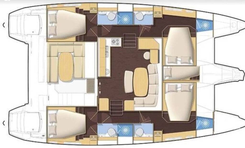 Grosser Katamaran mit 4 Doppelkabinen und zugehörigem Du/WC (jeweils 2 pro Rumpf) und komfortabler Kombüse.